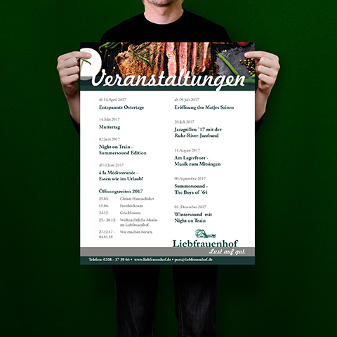 Puro gives the Liebfrauenhof a design of a special kind, without losing sight of the past by the revision of the logo, integration of a claim and reduction of the colors. In addition to the corporate design and the entire office equipment, Puro also developed the website that skilfully stages the excursion restaurant. Further measures in the relaunch are the "Culinary Calendar", which informs guests about upcoming events, the "Event Consultant" for successful parties and PR advertisements in the daily press.
